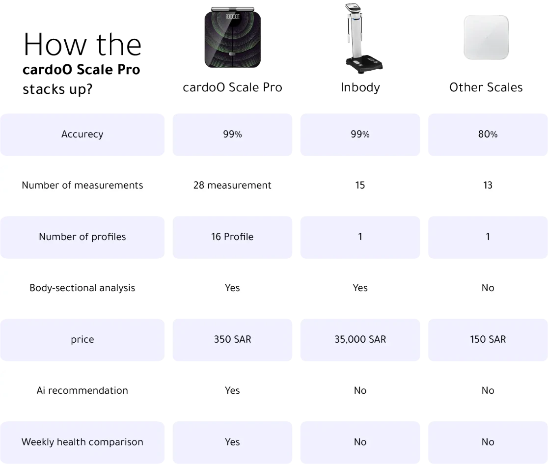 CardoO Scale Pro is a user-friendly body composition analyzer designed to provide advanced health metrics for professional use. It measures 28 key body parameters, making it ideal for athletes who want to track their progress convincingly at home.